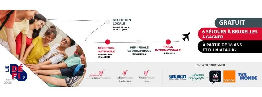 Le DEFI is a general knowledge quiz on French and Francophone cultures. This competition allows you to meet and challenge other French learners, first within your Alliance, then from the UK network with the AFs of Bristol/Bath, Devon, Jersey, Leeds, Milton Keynes and York, and finally with European and worldwide Alliances.